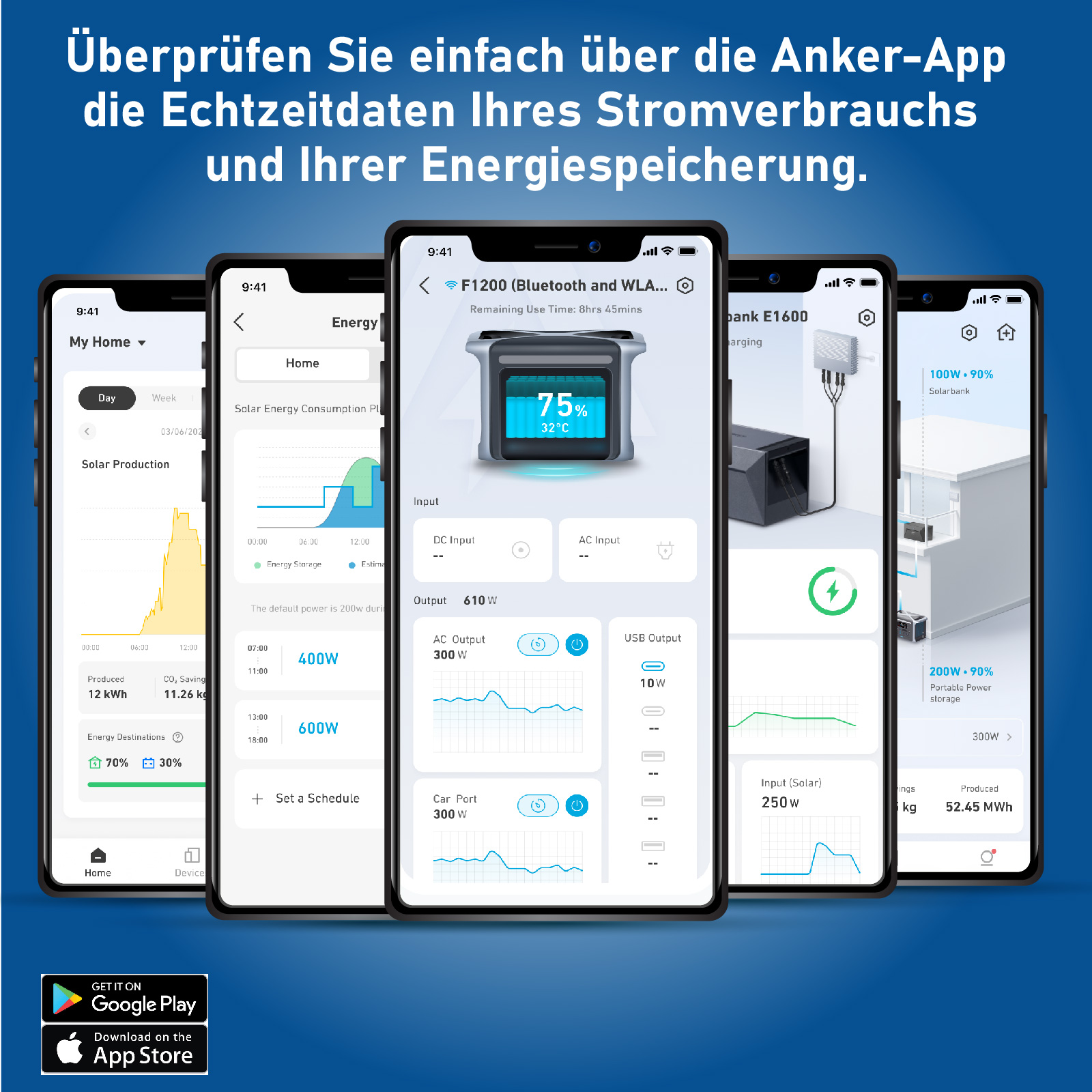 Echtzeit-Leistungsanalyse: Überwachen Sie den Stromverbrauch, die Energiespeicherung und die Kosteneinsparungen in Echtzeit mit der Anker-App.
