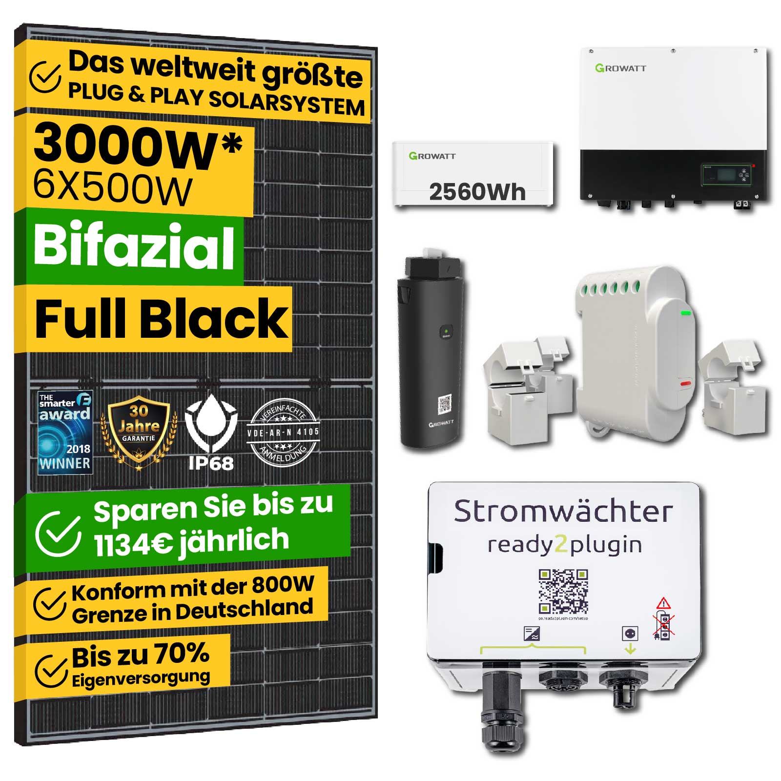 3kW Smart Balkonkraftwerk mit Speicher (bis 7,68kWh), Ready2plugin Stromwächter | 3000W Notstromsteckdose | Plug and Play Solaranlage