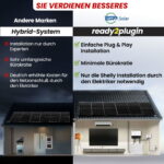 Das System ist für eine schnelle und unkomplizierte Installation konzipiert, ohne dass technisches Fachwissen erforderlich ist. Einfach die Solarmodule, den Ready2Plugin Stromwächter und den Wechselrichter an eine gewöhnliche Haushaltssteckdose anschließen – und fertig! Es gibt keinen komplizierten Papierkram oder umfangreiche Installationsprozesse, was es benutzerfreundlich und leicht zugänglich macht.