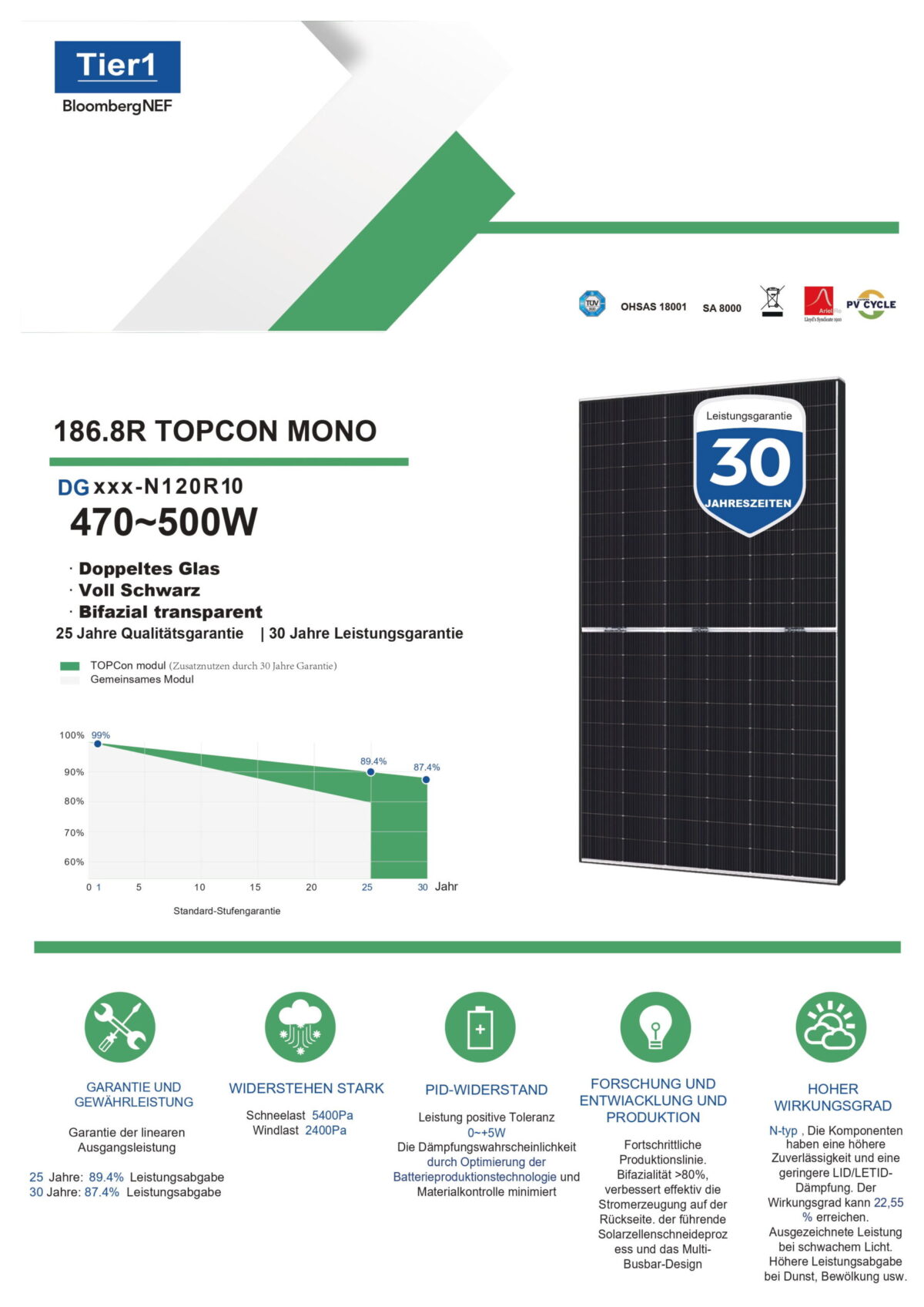 Das System umfasst: Bifacial-Modul: Nutzt Sonnenlicht von beiden Seiten für höhere Energieerträge.