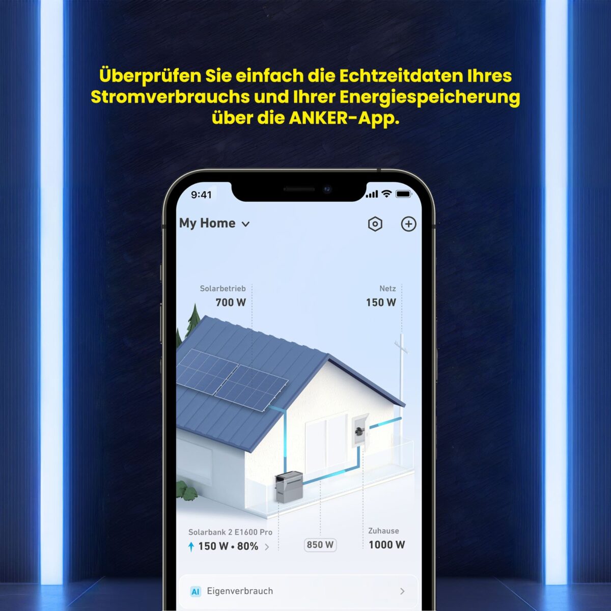 Bleiben Sie mühelos in Kontrolle mit der Anker App, die Echtzeit-Einblicke in die Solarstromerzeugung und den Haushaltsverbrauch bietet und es Ihnen ermöglicht, informierte Entscheidungen mit Leichtigkeit zu treffen.