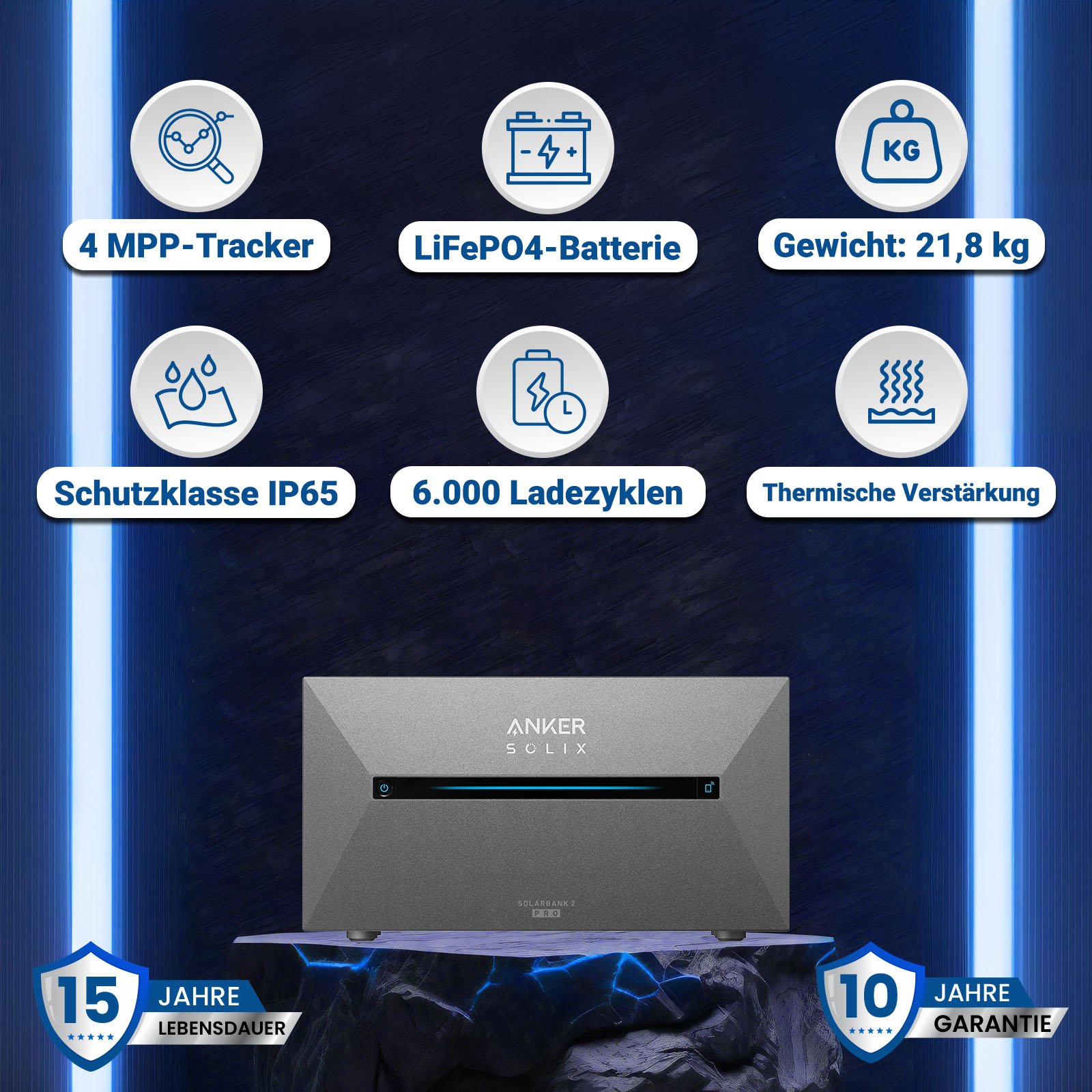 Der ANKER SOLIX 2 Pro bietet eine beeindruckende Lebensdauer von 15 Jahren, was langfristige Zuverlässigkeit und Leistung gewährleistet.