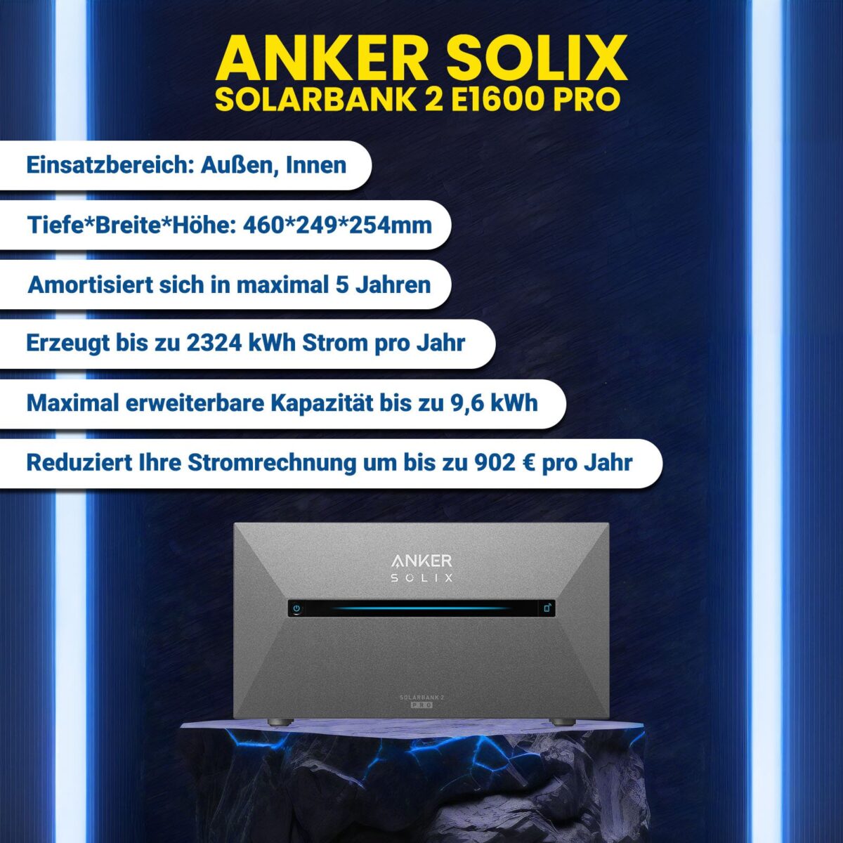 Beeindruckende Energiespeicherung: Der ANKER SOLIX 2 E1600 Pro bietet eine beträchtliche Kapazität von 1,6 kWh, erweiterbar auf bis zu 9,6 kWh mit zusätzlichen Batterien. Dadurch können überschüssige Tagesenergie effizient gespeichert und zur Stromversorgung Ihres Hauses in der Nacht genutzt werden, was zu einer Reduzierung Ihrer Stromrechnung um bis zu €902 pro Jahr führt.